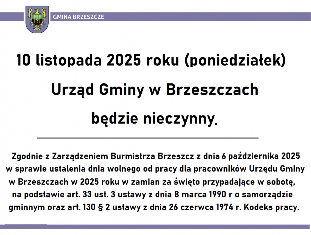 Zgodnie z Zarządzeniem nr 125/2025 Burmistrza Brzeszcz w sprawie ustalenia dnia wolnego od pracy dla pracowników Urzędu Gminy w Brzeszczach w 2025 roku w zamian za święto przypadające w sobotę, na podstawie art. 33 ust. 3 ustawy z dnia 8 marca 1990 r o samorządzie gminnym oraz na podstawie art. 130 § 2 ustawy z dnia 26 czerwca 1974 r. – Kodeks pracy.