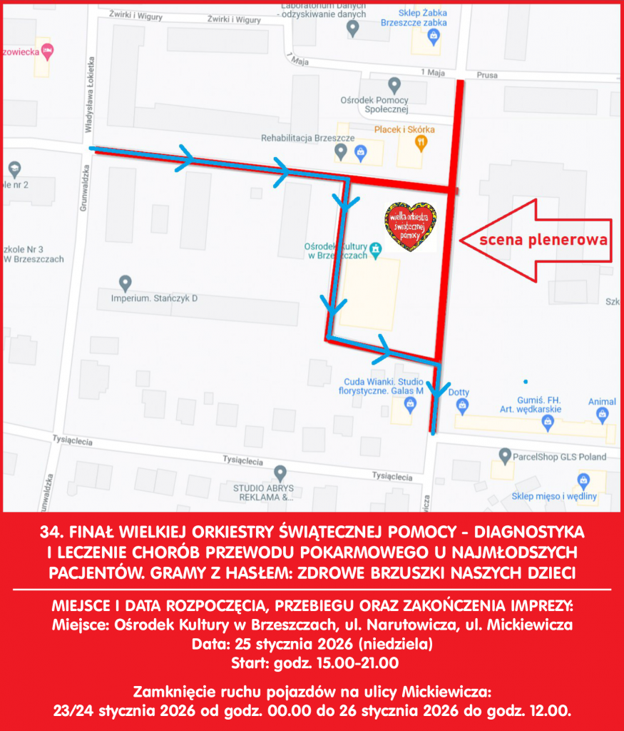 W związku z organizacją koncertu i budową sceny plenerowej od północy z piątku na sobotę 23/24 stycznia (godz. 0:00) do poniedziałku 26 stycznia do godz. 12:00 zmieniona zostanie organizacja ruchu w okolicy Ośrodka Kultury.