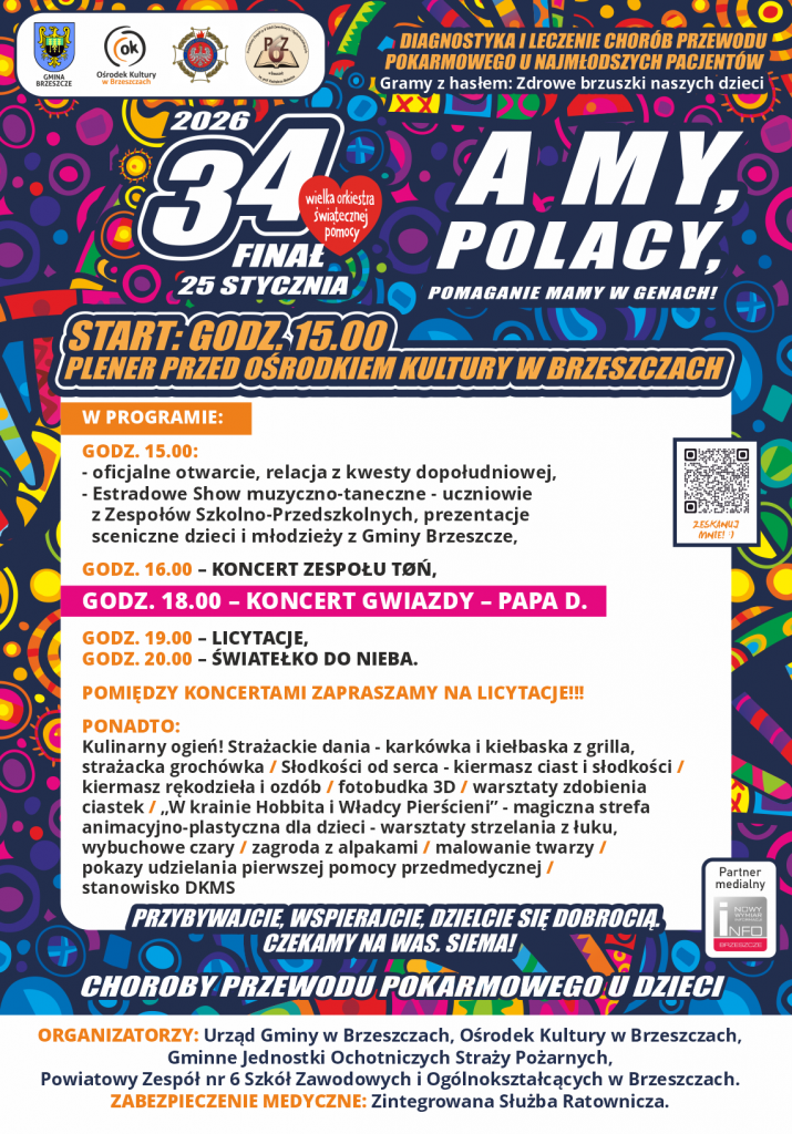W niedzielę 25 stycznia 2026 roku w całej Polsce już po raz 34. zagra Wielka Orkiestra Świątecznej Pomocy. Także Gmina Brzeszcze, jak co roku, włącza się w tę szlachetną akcję. Brzeszczański Sztab WOŚP przygotował mnóstwo atrakcji - będą warsztaty, strefa animacji dla dzieci, stoiska z kulinarnymi specjałami, licytacje i koncerty. Gwiazdą tegorocznego Finału będzie Zespół PAPA D!