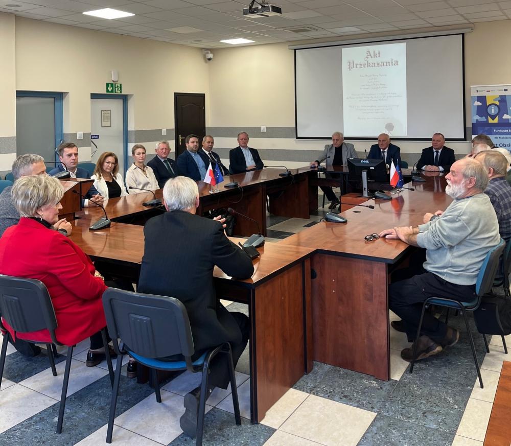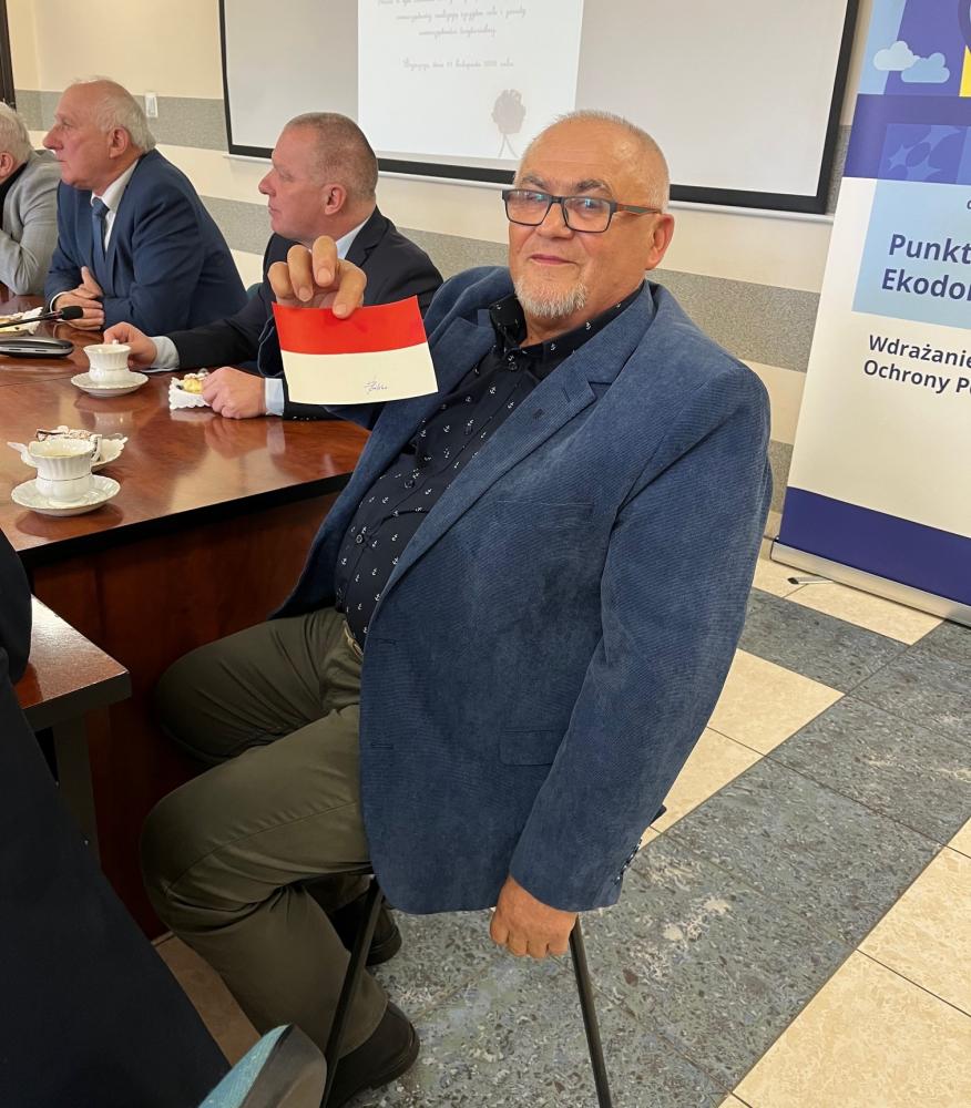 W trakcie spotkania pojawiły się także osobiste akcenty związane z historią urzędu. Pan Jan Kulig, radny tamtej kadencji, zaprezentował zachowany fragment wstęgi z uroczystego otwarcia budynku — pamiątkę, która przez lata przetrwała w jego zbiorach jako symbol początku nowego etapu w życiu gminy.