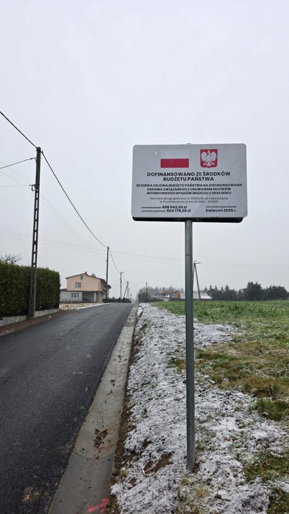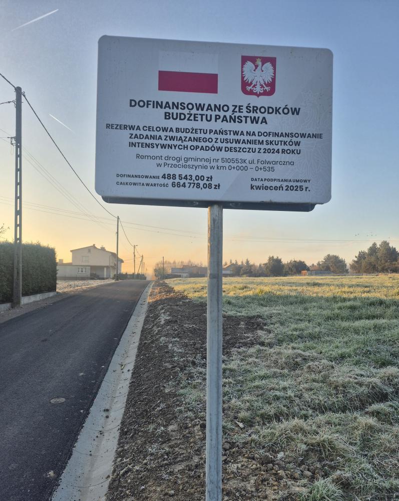 Odbiorem końcowym robót w piątek 21 listopada br. zakończył się remont ul. Folwarcznej w Przecieszynie.  Modernizacja drogi została sfinansowana dzięki dotacji celowej udzielonej Gminie Brzeszcze z budżetu państwa na wykonanie robót budowlanych w ramach usuwania skutków opadów z września 2024 roku, noszących znamiona klęski żywiołowej w postaci powodzi.