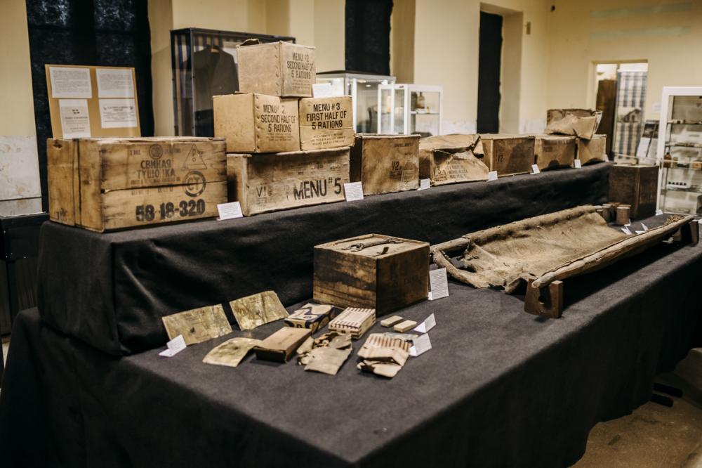 Fundacja przedstawiła oryginalne prowizoryczne nosze wykonane z jutowego worka rozciętego po szwach i dwóch drewnianych drążków, które zrobiono w jednym z okolicznych gospodarstw, by wynosić z baraków chorych więźniów i tych nie mających siły samodzielnie się poruszać. Przedstawiono oryginalne metalowe puszki, skrzynki i kartony z amerykańskich wojskowych racji żywnościowych oraz lekarstwa. Żywność i lekarstwa pochodzą ze Stanów Zjednoczonych, z zaopatrzenia wysyłanego na potrzeby wojenne dla Rosjan tzw. Lend Lease i do Auschwitz, wtedy już do wyzwolonego Oświęcimia. Dotarły wraz z żołnierzami z Frontu Ukraińskiego, którzy wyzwolili kompleks obozu KL Auschwitz od Niemców.