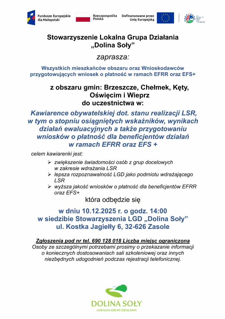 Lokalna Grupa Działania "Dolina Soły" zaprasza  mieszkańców oraz Wnioskodawców przygotowujących wnioski o płatność w ramach EFRR i EFS+ do uczestnictwa w spotkaniu informacyjnym organizowanym w formie kawiarenki obywatelskiej, dotyczącym przygotowania wniosków o płatność, stanu realizacji Strategii, w tym o stopniu osiągniętych wskaźników, wynikach działań ewaluacyjnych. Spotkanie odbędzie się w środę 10 grudnia 2025 r. o godz. 14:00 w siedzibie Stowarzyszenia w Zasolu, przy ul. Kostka Jagiełły 6.