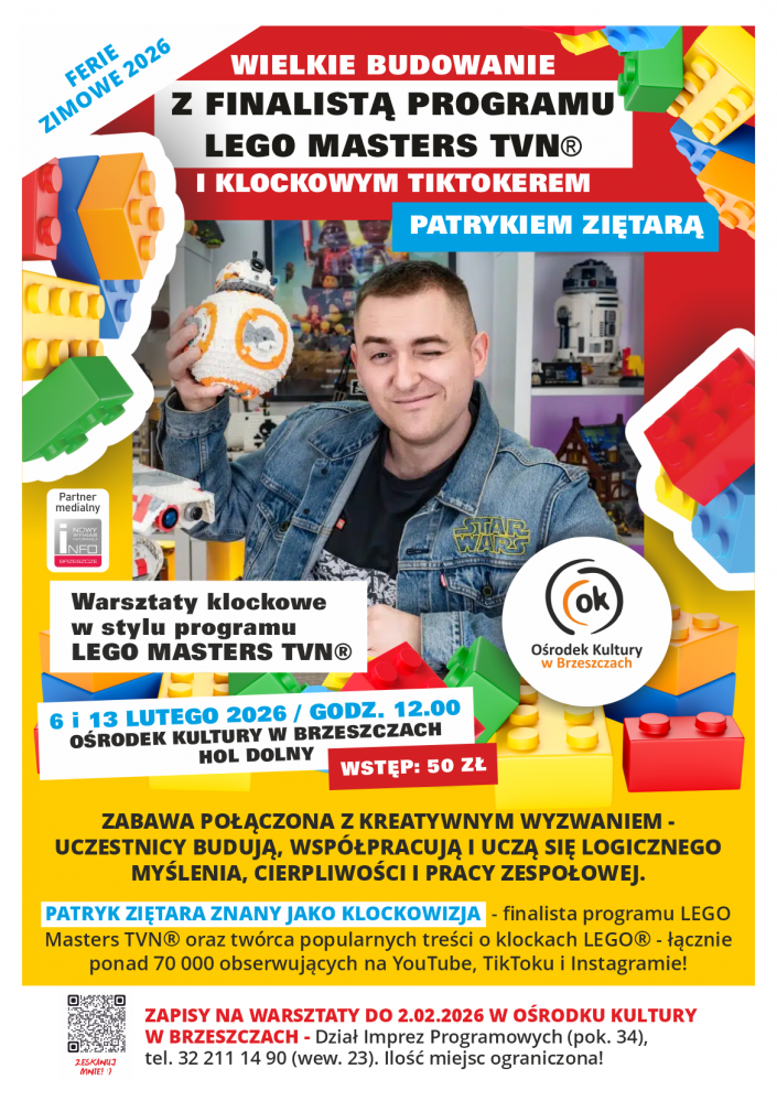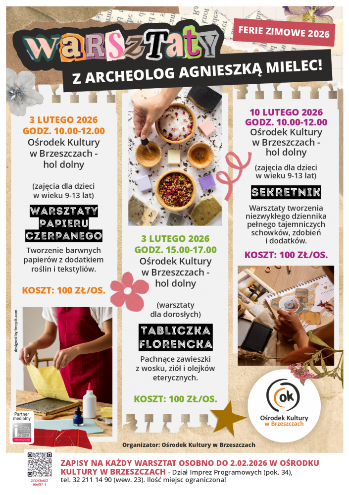 Zapisy na warsztaty do 02.02.2026 : Ośrodek Kultury w Brzeszczach, Dział Imprez Programowych, pok.34 tel. 32 211 14 90 (wew. 23). Ilość miejsc ograniczona!