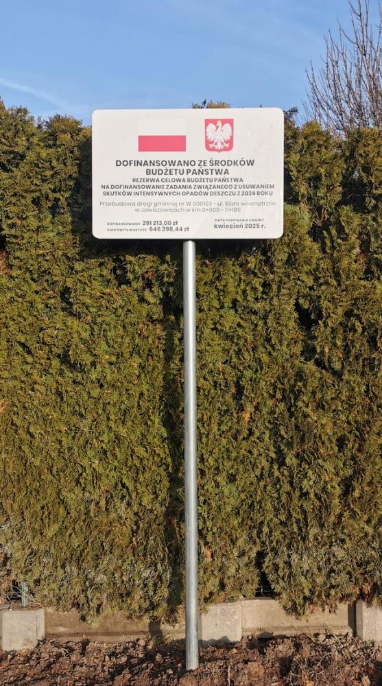 W ramach zadania pn.: „Przebudowa drogi gminnej nr W000103 – ul. Biała w Jawiszowicach od km 0+000,00 do km 0+185,00” wykonano roboty przygotowawcze i rozbiórkowe, stabilizację podłoża z warstwą mrozoochronną, podbudowę, krawężniki oraz warstwy nawierzchni z betonu asfaltowego. Ponadto wykonano zjazdy do posesji i odwodnienie drogi (kanalizację wraz ze studniami sieciowymi i wpustami ulicznymi oraz zbiornik retencyjny).