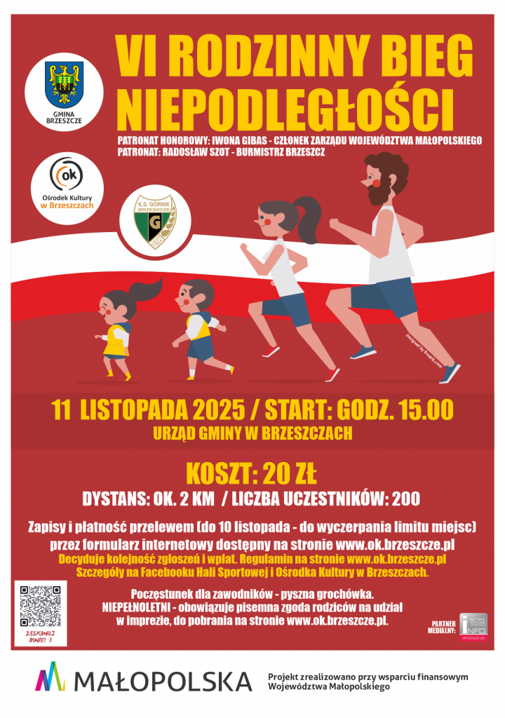 11 listopada 2025 roku odbędzie się szósta edycja Rodzinnego Biegu Niepodległości. Zapraszamy całe rodziny, biegaczy bez względu na wiek, by radośnie i na sportowo uczcić 107 rocznicę odzyskania przez Polskę niepodległości. Bieg, organizowany przez Klub Sportowy "Górnik" Brzeszcze we współpracy z Ośrodkiem Kultury w Brzeszczach, został objęty patronatem Burmistrza Brzeszcz.